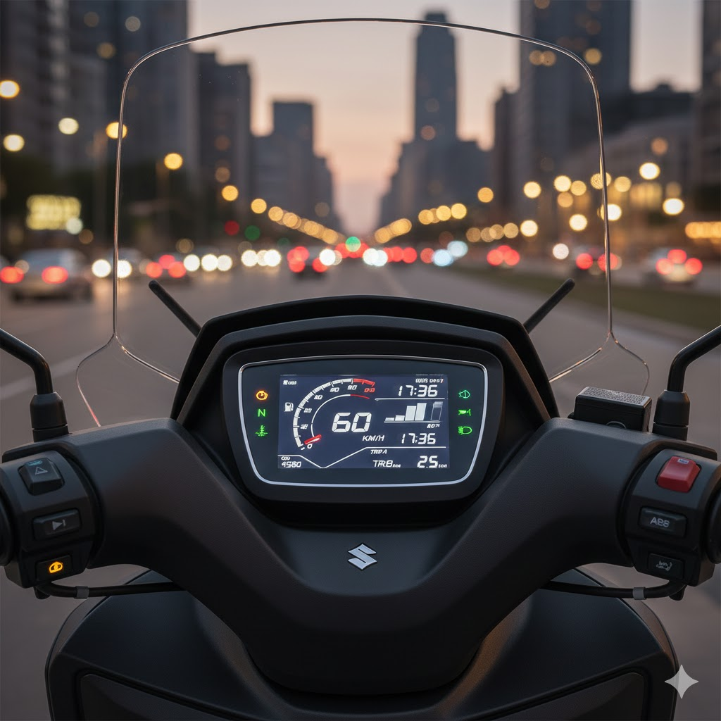 Suzuki Burgman Street 125 EX dilengkapi panel instrumen digital yang informatif. Tampilan layar cukup jelas dan mudah dibaca, menampilkan informasi penting seperti kecepatan dan indikator bahan bakar.